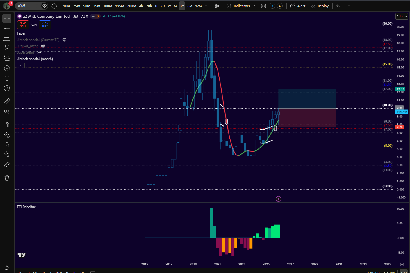 A2 milk looking like it wants to change ranges into the 10-20 long term channel with long break out. could have some issues at the 10 dollar mark but should break through.